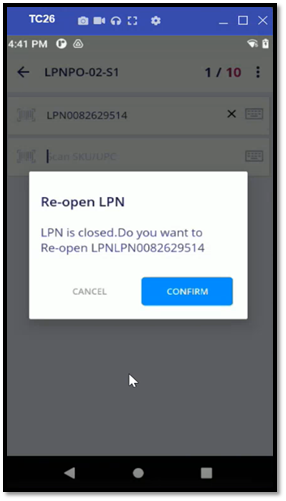 - If the user scans an LPN that has been closed but not yet put away, they will receive a notification: "LPN is closed. Do you want to reopen LPNXXXX". Confirming this will reopen the LPN for further processing.