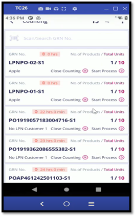 - Close LPN: Upon clicking this button, the LPN is closed, the received quantity is confirmed, and the LPN moves to the put-away stage. The user is redirected to the SKU scan screen, where they must scan a new LPN to continue the GRN process if required.